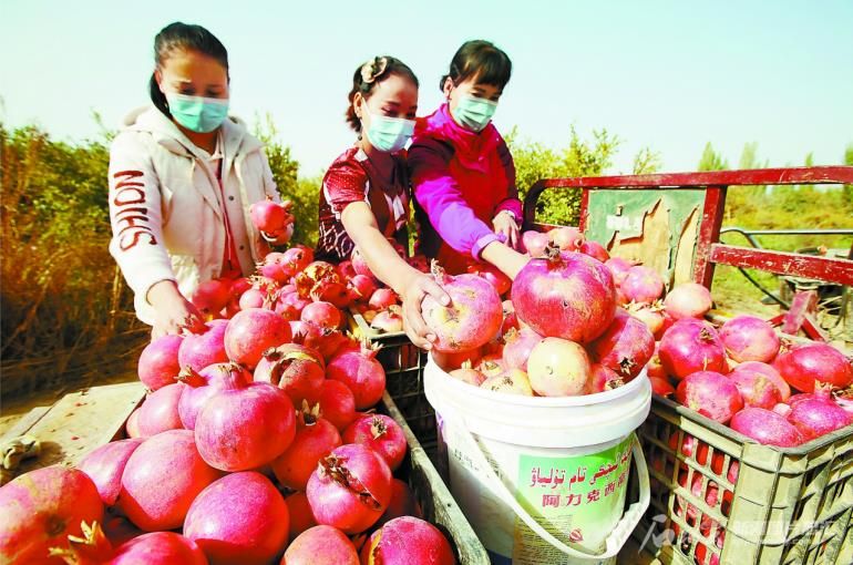 10月14日,库车市乌尊镇英吐尔村果农在分拣石榴。 今年,该镇石榴获得丰收,亩均增收有望达到6000元左右,种植石榴已成为果农增收的重要渠道。 尼亚孜·热合曼摄
