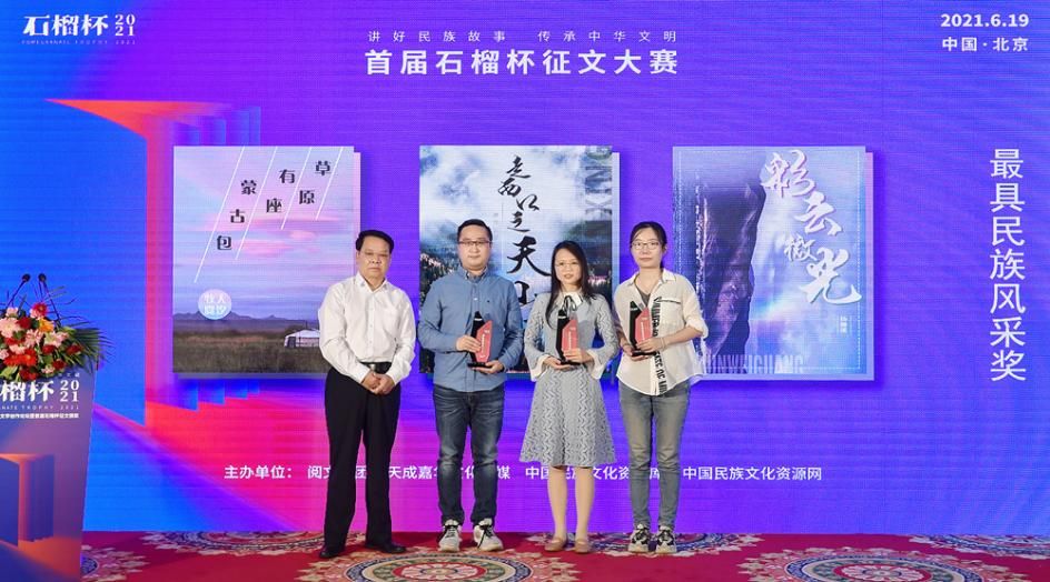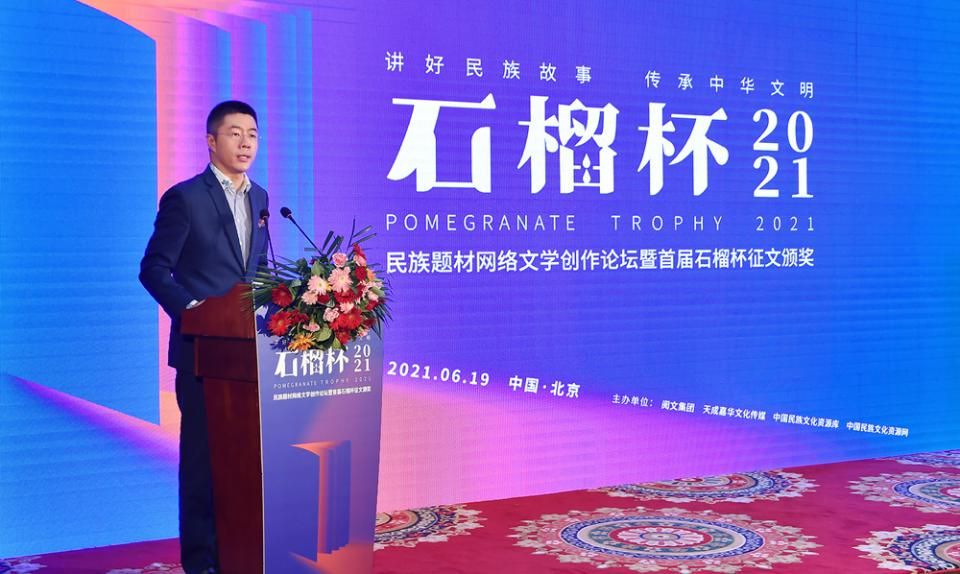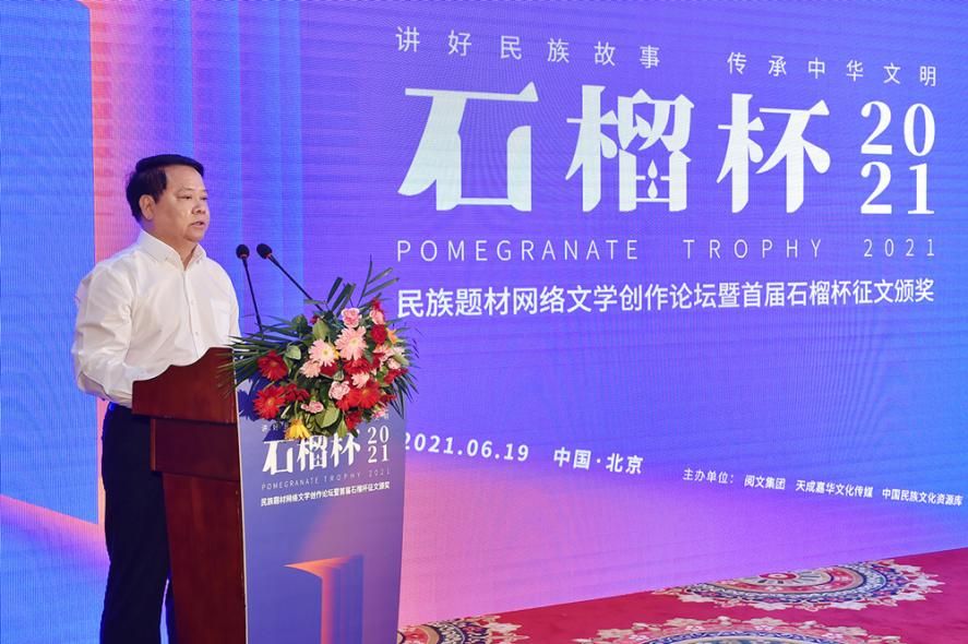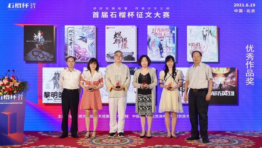 6月19日,民族题材网络文学创作论坛暨首届石榴杯征文大赛颁奖典礼在京举行。作为国家民委主办的“中华民族全家福”系列活动之一,首届石榴杯征文大赛得到了国家民委文化宣传司和中国少数民族文化艺术促进会的指导与支持,由阅文集团联合天成嘉华文化传媒、中国民族文化资源库、中国民族文化资源网共同举办。本届大赛以“讲好民族故事 ,传承中华文明”为主题,涌现出众多弘扬民族精神、表达文化自信、传播正能量的作品。经过专家推荐及严格评审,《草原有座蒙古包》、《走西口之天山行》、《彩云微光》等三部作品获“最具民族风采奖”,《神藏》、《欢想世界》、《烂柯棋缘》、《时光和你都很美》、《恰似寒光遇骄阳》、《黎明医生》、《暖君》、《惊雷》、《大讼师》、《消防英雄》等十部作品获“优秀作品奖”。所有获奖作品都将收录入中国民族文化资源库。中国作家协会副主席、书记处书记吉狄马加表示,本届石榴杯大赛是在党和国家长期以来坚持的对民族文化、少数民族作家创作和民族题材创作的大力扶持下,依托网络文学平台,将文学作品与影视作品改编、游戏、动漫产品制作结合起来,探索的一条发展民族文化的新路,具有开创意义。