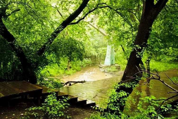 横贯沙滩,百里藏幽,满是绿荫。望连绵古树,遮天蔽曰,松榆椴橡,南北联姻。翠鸟欢歌,繁花绽蕊,千眼喷泉四季吟。游人喜,叹梦中仙境,绝妙园林。