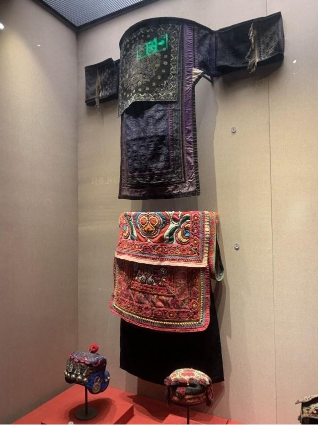婴孩的背扇和童帽(许觊佳摄于贵州省民族博物馆)