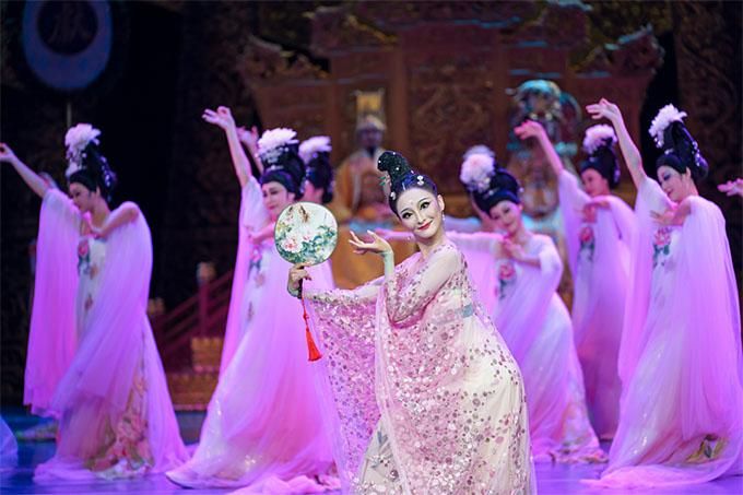 该剧在情感叙事和舞蹈语言上,采用“意中生象”“象中达意”的方式,从细微处融入唐代各地域各民族文化元素,凝练舞剧艺术品质:如取李白“醉入胡姬酒肆中”诗意演绎《胡姬舞》;取唐代画家周昉《簪花仕女图》画意演绎《簪花舞》;取唐代画家张萱《捣练图》笔意演绎《捣练舞》;取王维“大漠孤烟直,长河落日圆”诗意生发《西凉武舞》等。在剧情发展和戏剧冲突中,设计符合人物性格的“独、双、三”主题舞段:凸显西域风情的《胡旋舞》、表现曲江踏春的《采桑舞》和展示教坊舞技的《白纻舞》等情景舞段,展现了鲜明的民族文化交融特征,实现了中国传统文化跨越时空的当代表达。