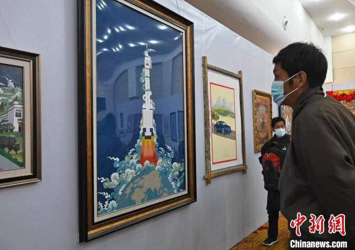 边巴是作品《一飞冲天》的作者,这位画师从1979年从事唐卡绘画至今。他说,该作品以神舟十三号为主题,描绘了飞船冲出地球奔向星辰大海的瞬间。采用勉唐派唐卡绘画语言和传统矿植物颜料。同时融合了汉藏审美视角,立足于中国放眼世界的人类命运共同体胸怀,尝试新时代新唐卡新融合的艺术表达。