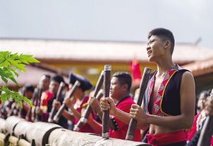 云南省沧源县班洪乡班洪村的佤族群众身穿节日盛装,敲响佤族木鼓。新华社记者 江文耀摄