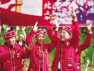 岩翁(右一)手持习近平总书记回信欢呼。新华社记者 江文耀摄