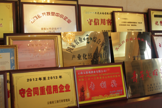 十几年的风雨兼程,太阳魂酒业有限公司荣膺多项殊荣,先后获得“云南省农业产业化省级龙头企业”、“云南省农产品加工重点企业”、“全国休闲农业与乡村旅游示范点”、“云南省著名商标”、“云南省省级企业技术中心”、“2009中国(昆明)酒业发展高峰论坛暨新中国60周年云南酒业十大功勋品牌”及“云南酒类消费市场十大最具成长性品牌”、“云南省接待用酒”等荣誉称号。已获得QS认证、ISO9001认证,HACCP认证等高标准企业资格证书。产品质量达到国内先进水平,酿制的“赤霞珠”葡萄酒获2006年亚洲葡萄酒质量大赛金奖、北京国际葡萄酒暨烈酒挑战赛铜奖和第八届中国国际葡萄酒及烈酒评酒会上荣获银奖,梅里圣地冰酒荣获2006年亚洲葡萄酒大赛银奖、2012年亚洲质量大赛金奖及领袖产区代表产品。朗姆酒2011年荣获“2011中国(蓬莱)国际葡萄酒•烈酒品评赛”银奖。2011年国际酿酒师葡萄酒烈酒大赛中获得银奖,2012年获得国际酿酒师葡萄酒烈酒大赛金奖。2012年,公司酿造的赤霞珠产品被法国勃艮第大学葡萄酒学院指定为教学用酒。2013年7月,“梅里圣地赤霞珠冰酒”荣获2013中国优质葡萄酒挑战赛金奖。同时,公司位于德钦产区的干红及冰酒已通过有机产品认证。2014年“2012梅里冰酒”荣获国际领袖产葡萄酒(中国)质量大赛优质奖,拍品价格1万元。