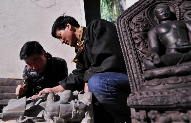 土登加措(右)和他的徒弟在雕刻黑玉石佛像(1月8日摄)。