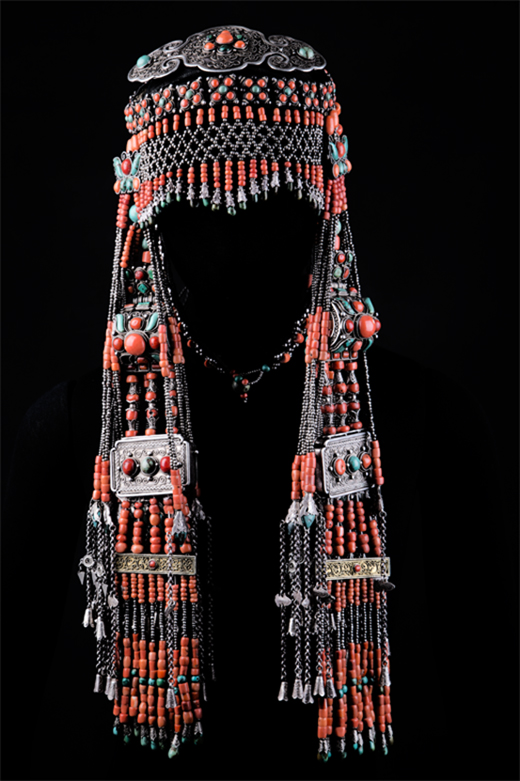 头箍饰:是整个头箍是头饰的中心骨架,也是头饰的中心饰件,饰于头围,呈圆扁形环状饰带, 多以青色绸缎布打成袼褙后剪制成底衬, 与头围周长相吻合。在其表面以绸面贴饰,再依个人爱好在头箍外缘表面上, 钉缀银托。银托可分三种:其一为圆形錾花掐丝云纹银托,其银錾花中间为圆形环饰, 间镶嵌呈半圆体形红色珊瑚珠,由白色银錾托饰托起, 钉缀在青色绸箍之上, 青、白、红相映, 艳丽无比;其二在银錾托花饰正中,有一个较大的银錾托花正好饰在额前双眉之上,呈桃形银錾托花,上镶嵌半圆体形珊瑚珠,并在珊瑚珠周围镶嵌叶片形绿松石珠,从整体造型来看似一串水晶般红绿葡萄在额前闪耀, 十分华丽;其三在前额头箍处, 于半圆形浮雕式的银錾花托间隔金刚杵形银托座, 在托坐之上镶嵌长圆柱形的珊瑚珠, 美观庄严, 具有宗教含义。