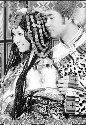 藏式婚礼上,身穿盛装的一对新人 一、 悬挂经幡,真诚祈福 藏式婚礼的仪式上,婚礼双方家庭首先...