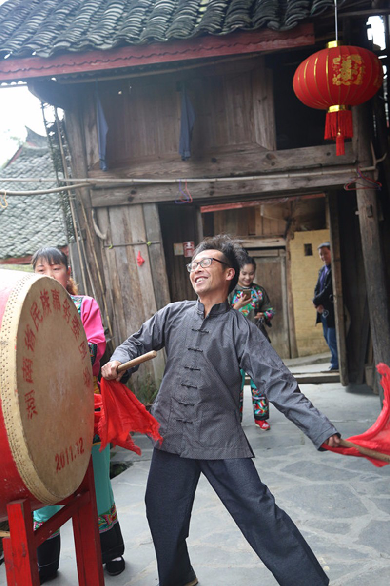在“幸福人家”客栈门前,杨超文与妻子神采飞扬地敲响了苗鼓