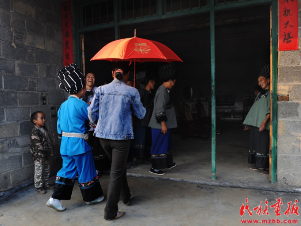 姑娘出嫁必须有娘家人陪送,婚礼这一天清早,“新娘”便在“接亲客”的带领和送亲队伍的陪同下,一路欢声笑语 ,浩浩荡荡向“新郎”家走来。走到新郎家村边,有的燃放鞭炮,一直燃放到新郎家门口,请新郎父母出来开门;无鞭炮准备的,则在寨边稍候,由迎亲伙伴飞报新郎家做好迎亲的准备。男方父母听到后,多数是很高兴地喊醒家中儿女,由新郎的妹妹或堂姐妹为迎亲主体,加上寨上的姐妹和房族组成迎亲队伍,打开大门,把新娘迎进家来。接亲的主要仪式是接伞。接伞的人必须是新郎的小妹或堂妹。无亲妹、堂妹者则由新郎父母指定一与新郎同辈份的小姑娘去接。新娘走至大门,即由新郎的妹妹跨出门外迎接新嫂子,新嫂子接着用左手把雨伞递给接伞的妹妹,接伞妹妹接过新嫂子手中的雨伞后,新娘即用左脚跨进屋内,以示今后成为新家庭的主妇。随即由接伞妹妹携新娘手迎入新房,迎亲妇女们陆续进入新房休息。入门后,新郎家的“陪娘”及姑娘们便热情地安排“送亲客”团团围坐,并簇拥着“新娘”紧靠堂屋中柱子就坐,意为“新娘”从此当家立业,将来就像中柱子一样,顶大梁,撑起这个家。