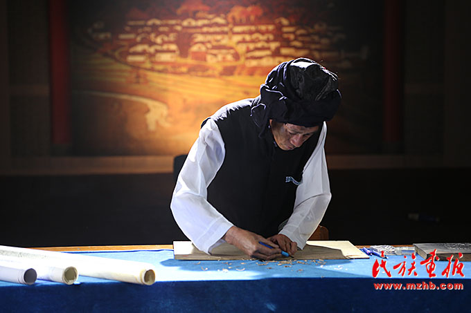 云南省级“非遗”传承人、马关壮族农民版画师卢正林在制作版画