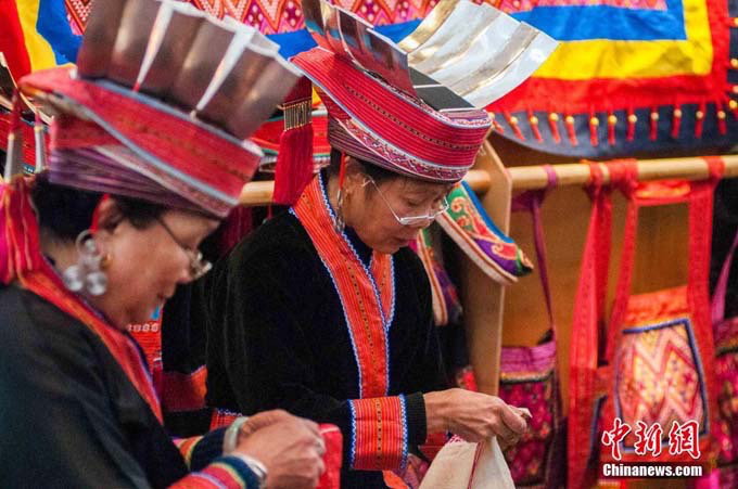 12月6日,在中国瑶族之乡广西金秀瑶族自治县的盘王节上,当地瑶族百姓展示瑶族织绣