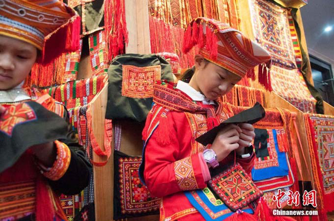 12月6日,在中国瑶族之乡广西金秀瑶族自治县的盘王节上,当地新一辈瑶族女孩展示瑶族织绣