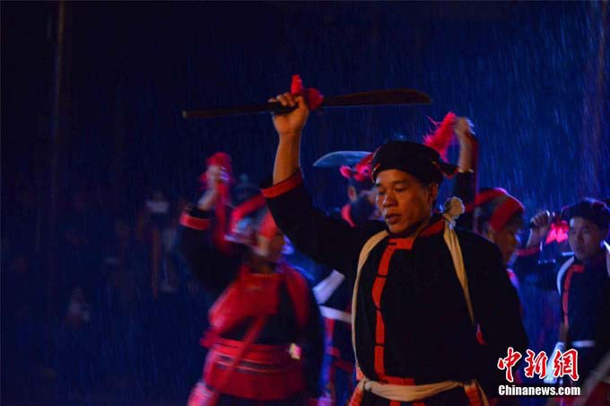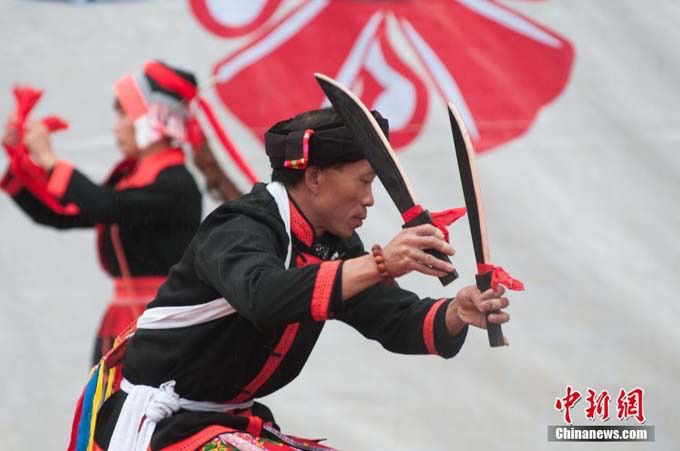 12月6日,在中国瑶族之乡广西金秀瑶族自治县的盘王节上,当地瑶族百姓在跳”刀舞”