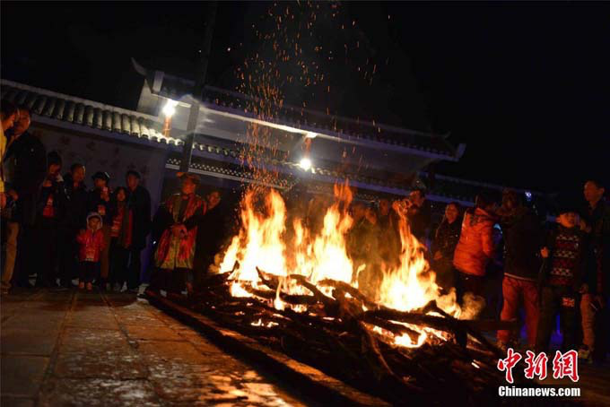 12月6日夜晚,在中国瑶族之乡广西金秀瑶族自治县瑶族百姓在盘王节上,展现当地瑶族民间绝技——下火海