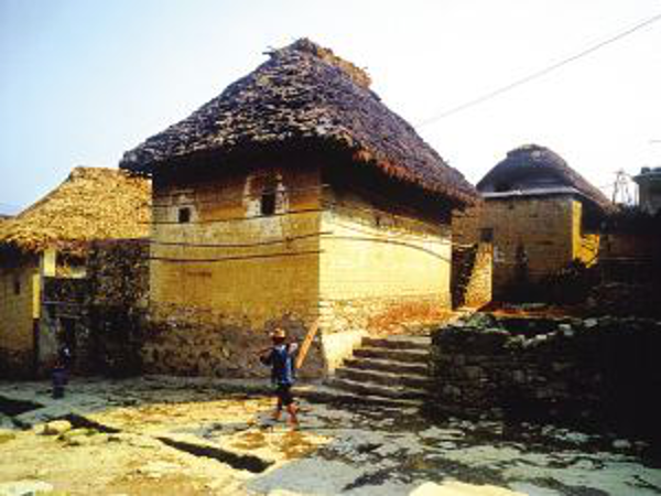 蘑菇房,顾名思义,它状如蘑菇。房子的墙基用石料或砖块砌成,地上地下各有半米,在其上用夹板将土舂实一段段上移垒成墙,最后屋顶用多重茅草遮盖成四斜面。