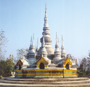 云南勐龙曼龙飞笋塔。勐龙曼飞龙笋塔始建于公元1204年,塔群造型紧凑,挺拔多姿,诸塔拥立,犹如雨后春笋,故得名。主塔尖端是铜制的风笛,小塔顶部挂有铜制佛标式的风铃,山风吹来,大小塔清脆的应和声响引人遐想。