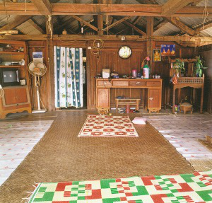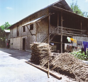 云南瑞丽的傣族民居。瑞丽的傣族民居是二层的竹楼,竹编外墙是利用竹皮正反面的纹理和光滑粗糙面编织的,从檐下垂直到底,均匀的缝隙透光通风,在强光照射下,其多变的几何图案更突出了工艺技巧和干栏式建筑的整体美感。屋面脊长,出檐短,大都用镀锌瓦楞铁板替代草顶。楼层四壁以竹篾板封闭,开尺许小窗。外附短柱作下层重檐的斜撑,四周再加一圈矮柱,与墙面斜撑配。