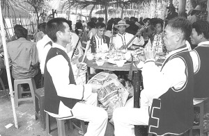 接着婚宴开始,八音队吹奏的乐曲优美动听,大家喝喜酒祝贺新郎、新娘;同时,男方家的带娘给女方家人开槟榔碗。开槟榔碗的顺序是女方家人由老到小分别接槟榔碗,意在感谢女方长辈、亲属对新娘的养育之恩。