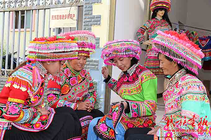 搬迁到傈园新村后,安学芬(左二)和妹妹安学珍在政府的扶持下办起了刺绣手工坊,为了提高绣品质量,他们经常与同村妇女进行刺绣手艺交流