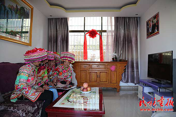搬到新村后,村民们的生活多了几分乐趣。村民张晓倩(右二)拿出自己的结婚照与姐妹们分享这个幸福的瞬间