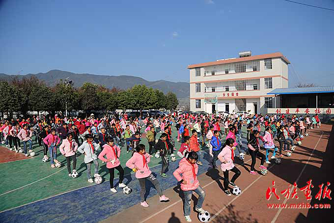 在新村联排别墅的最南边是中村乡小学,这所学校是同傈园新村相依而伴建在一起的。上午十点,课间操的铃声打破了新村的宁静。学生们欢快地冲出教室,每人手捧足球,来到操场。在老师统一的号令下,孩子们跳起了足球课间操。欢快的音乐旋律,伴着运球、带球等不同的动作,孩子们的天真烂漫得到了充分诠释。小学校长张世喜看着学生们欢乐的表情,高兴的表情溢于言表。他说:“孩子们太幸福了。”16年前,张世喜从楚雄师院毕业回到了家乡的中村乡峨山村委会小学,“场是土巴地,篮球架是用两棵大树做成的,教室里的桌椅高矮不一,找不到品相相同的两张课桌,孩子们的宿舍是两三个人挤一张床……”回忆起那时情景,张世喜记忆犹新。 “现在好了,住宿生县财政每月每人都要补贴100元伙食费,孩子们顿顿有肉吃了,还为我们建起了两栋宿舍楼,268名住宿生每人一张床,再也不用挤着睡了。”张世喜说,在这样的办学条件下,我们工作越来越有激情了。