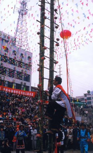 节日里,妇女们穿着镶花边的黑色上衣和点缀着各种银饰物的花裙,佩戴耳环、项链等首饰,风采夺人。男人穿着麻布短衣裤,腰系红黄长带,小腿系吊简,腰佩长刀,肩挎箭包,英姿勃勃。节目的广场上,坚趄两根二十米高的树干,四周用藤蔓拉紧固定,树杆上插有三十六把明晃晃的长刀,作为向上攀登的横档,刀刃向上,寒光逼人,谓之“刀竿午间。鞭炮齐鸣,锣鼓震天”。身穿大红抱、头缠红布包头、赤脚的五名“玩火者”,齐涌至竿下,围绕刀竿唱歌跳舞,将斟满的白酒一饮而尽,纵身飞上刀竿。双手紧提刀面,运足气的脚掌斜置在锋利的刀刃上,勇敢、灵巧地向上攀登。全场鸦雀无声,大家屏住呼吸仰面观看,对他们的气功绝技赞叹不已。噼噼啪啪的鞭炮声来自竿顶优胜者,响彻云霄。全场欢呼跳跃,争相向爬杆者敬献美酒。对歌、跳舞、荡秋千活动为节日增添了浓郁的气氛。丢烟包(烟盒)活动别具一格,青年男女各站一方,互掷烟包,姑娘将小伙的烟包收藏起来,说明姑娘接受了小伙子的爱慕。