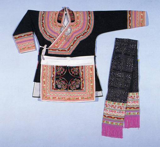 由于畲族长期与汉族杂居,现在畲族男子服装与当地的汉族人基本没有区别,闽浙一带的畲族妇女还保留着明显的传统服饰特色。畲族妇女的服装称为“凤凰装”,上衣多为黑色大襟服,领高2~4厘米,两旁开衩,后裾长于前裾,通身无扣,只在右衽襟角缝有两条蓝色、白色或红色系带,衣领、袖口及两襟饰以红、黄、绿、蓝、黑五色花线绣成的各式花边,有的花边由衣领延伸至肩部和胸部,中青年妇女的服装花多、花边宽,老年妇女的服装花少、边纹窄。而居住在不同地区的畲族妇女,其凤凰装也略有差异,主要可分为福安式、福鼎式、霞浦式、罗连式、丽水式几种。
