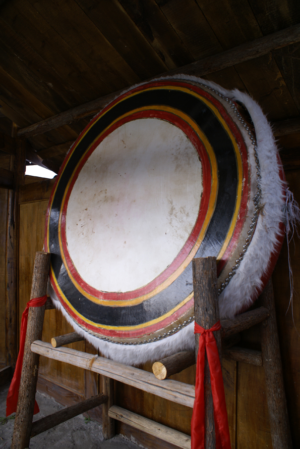 羌族羊皮鼓是打击乐器,又名“羌铃鼓”,羌语称“切欧兀”“切热别日木”。有两种形状,一种是圆形鼓面的铃鼓,直径大约30—40厘米。鼓边宽约15厘米,鼓柄置于正中,抓柄的长度与鼓面的直径相同,左手从背面握柄。另一种是扇子形状的铃鼓,鼓框和鼓柄为铁制,抓柄端有一装饰环圈,圈内串以数个铜钱。两种形制鼓面均蒙羊皮,各鼓音高低不一,鼓锤为竹制,敲击的一端略微呈弓形。羊皮鼓的打法和鼓点的节奏变化丰富。目前,搜集到的有硬三鞭、软三鞭、野鸡扑、偷点子、牛擦痒等十多种。这些鼓点穿插在每个唱段与舞蹈衔接变化中,使表演者在统一的步伐、统一的动作中,调节了节奏气氛。由于表演具有即兴式特点,表演者的技术娴熟程度和思想情绪变化将直接影响技巧的发挥。羊皮鼓突出鼓的表演,气氛热烈欢快,动作粗犷质朴,如“禳星辰”动作,就是在鼓点、唱腔、动作的有机结合中,表现出凛冽的气势。羊皮鼓在表演中,不仅给舞蹈提供了节奏,丰富了气氛,而且鼓点的击打更形成和衍化出许多独特的舞蹈语汇。