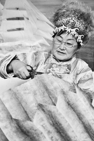 尤文凤介绍,鱼皮画因风格独特,很受市场欢迎,而它的很多工序其实都来源于鱼皮衣制作技艺。尤文凤对鱼皮画的制作是从2000年开始的。“母亲曾和我谈起,以前过节时,赫哲人会在窗户上贴上四方菱形的窗纸,纸上描绘着花鸟鱼虫以及龙凤等吉祥图案。后来我根据和母亲聊天的内容,一边回忆、一边复原,就做成了现在的鱼皮画。”尤文凤说。