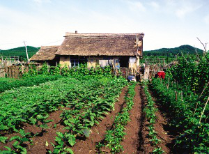 赫哲族人多用锹把粗的柞木夹成障子,形成院落。房屋前面留块院子,养鸡、猪,放酱缸、农具,码着成排的木柈子垛;房后的菜园子较大,种些架豆角、黄瓜、茄子、小葱、辣椒、西红柿等蔬菜。黑龙江同江市街津口村的街道东西走向,道南的房子从后面开门绕过山墙进院,菜园子在前院;道北的房子从前门穿过菜园子边的巷道到前院再进屋。