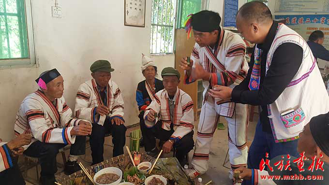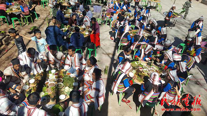 “过去过节,手头拮据,经常是三五户人家凑钱杀一头猪。由于物质匮乏,节日前,男女老幼都上山挖野菜,杀猪当天,到地里砍芭蕉花,带上柴火去寨老家里煮年饭吃,节日第三天去寨老家唱歌跳舞。” 记者聆听着87岁基诺族老人周白讲述基诺山寨的回忆。如今的他已是四世同堂,在耄耋之年能享受天伦之乐,过上幸福生活,他心存感激。节日当天老人们在村委会聚餐,席间接受年轻人的敬酒与祝福,其乐融融。