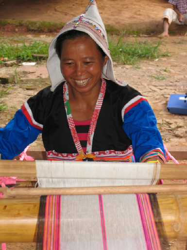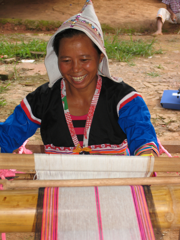 基诺族竖线花纹的衣料是独具民族特色的基诺族织锦“砍刀布”。