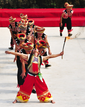 三江县高基瑶族乡的瑶族同胞表演传统民俗吞火把