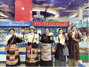 文措(左三)和“阿佳”们带着产品参加2020年西藏脱贫攻坚产业扶贫成果展。受访者供图