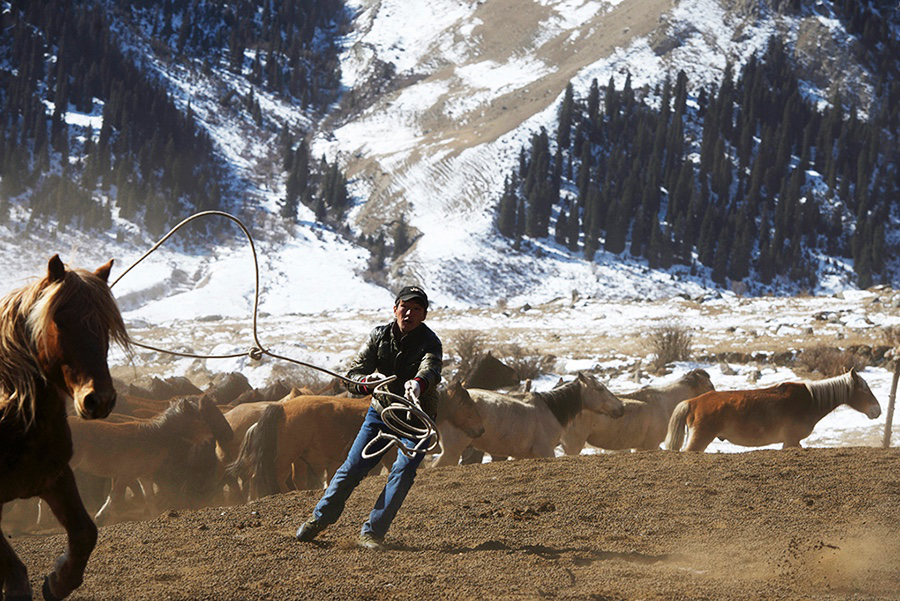 我首先到访的是达楞达坂一带。接待我的主人卡玛仪表堂堂,60多岁还在照料自家的畜群。老人没有兴趣放羊,每天吆着100多匹马和300头牦牛在日月间往复。一望无际的雪原,把暴烈的马群和野性难驯的牦牛吆往一个地方或再吆回去,骑马的强度与奔跑的频率远不是他这个年纪的人所能驾驭的了。但老人不这么想,他不愿意在和静县城的暖气房子里喝茶陪孙子们,而更愿意在他的马背上,每天奔波在雪原上。