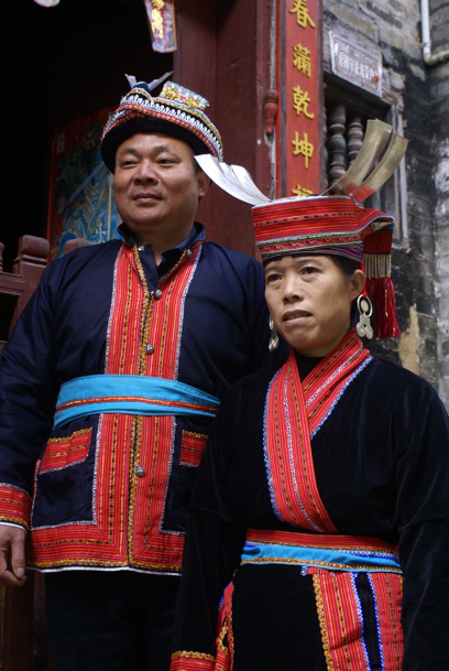 瑶族支系众多,大凡自称不同,服装则有异,在这里就简单介绍几种最具特色的瑶族服饰。自称为“勉”(他称“盘瑶”或“过山瑶”)的瑶族,分布广,人口多,其服饰样式最多。仅头饰就有顶板、尖头、平头和包头四种头型。妇女服装用蓝靛染成的布土制成,腰部以上的两边衣襟绣有八至十种图案。上衣无扣,用两丈多长的黑布作腰带,腰系围裙,前胸挂银牌、项链、周围镶有成串的红绒球,头缠精美的长条彩带。男子穿着对襟布扣唐装,以黑布包头。“勉”族系八排瑶的服饰,独树一帜。八排瑶男女头上都插有一根或数根白翎,象征英雄杀敌的利剑。男女均穿无领无扣子琵琶式襟服,腰束布袋,裤长稍过膝。男子身上常背一个五颜六色的绣花挎袋,大都为情人所赠之物。盛装时,全身上下佩戴精美银饰,走路叮当作响,甚是悦耳。妇女一般都喜欢佩戴耳环、手镯、戒指、颈圈之类的器饰。器饰式样多种,有的奇色异型,富有特点。