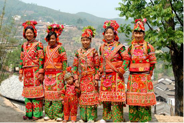 云南巍山彝族回族自治县各民族如壮丽的织锦,将生活装扮得五彩缤纷,充满诗情画意。其中特别是东山一带的彝族服饰色彩较为丰富,款式变化多姿,并且以大量的银制品和刺绣装饰,制作工艺之精良,堪称少数民族服饰一绝。以小孩帽而言,就有鱼尾帽、小瓢帽、银鼓帽、花帽和搭耳帽等数十种,名目繁多,式样各异。帽子上都绣有花草、树叶、龙凤图案,镶嵌着闪亮的银首饰,十分逗人喜爱。小孩的衣服式样也很多,大多由红、蓝、绿、白几种颜色的布料缝制而成,红绿交织,蓝白相衬,非常艳丽。如花朵一般的彝族少女通常头戴银鼓帽,坠耳环、身穿蓝领褂,腰系花围裙,下着绿彩裤,背挂圆裹背。银鼓帽和绣花鞋做工极为精巧,全套装饰花团锦簇,恰似一只开屏的孔雀。结婚后的妇女就不再戴帽子,改为结发髻,裹包头。发髻一般呈宝塔状,外裹黑纱和黑布包头,发髻上戴“别子”。“别子”其实就是发卡,均为银制品,分为四串,每串有两个灯笼绣球,两个响铃和两尾小鱼。包头巾外再用银串珠、亮球饰之。上衣着右衽大襟,前短后长、领、袖及襟边则镶以多层不同的金银丝瓣或自绣花纹的多层宽窄不同的花边。外罩齐腰蓝布短领褂,领口上安装着七个用银鼓钉凑成五个叶子,状如葵花形,彝语叫“披巴”的装饰。领褂四周皆用银鼓钉镶边,共四排,每排36颗。一件领褂上需有两百多颗银鼓钉,加上胸前佩戴银制的“三须”针筒,“菱角吊”串珠和鸡心型绣花荷包,整个装饰真是银装素裹,分外娇娆。腰间系的围腰布上,镶嵌多层金银丝瓣或自绣图案的花边。图案有串枝莲、牡丹花、太阳花及凤戏牡丹、丹凤朝阳等。无论未婚和已婚妇女,背上都有一个用羊毛擀制而成的圆型绣花裹背,直径约一尺不等,内外两层,中可承物,上绣两对太阳花,一大一小,对称排列。裹背除用作装饰外,还可保护腰部,既有欣赏价值,又有实用价值,这在巍山彝族服饰中是最为典型的一件饰物。银鼓帽绣有42朵小花,镶有96颗银鼓钉,帽顶插有花一朵或钉有樱花一束。其帽形如金鱼,鱼头鱼身为帽,鱼尾多岔分为护颈,亦称为“鱼尾帽”。绣花鞋呈船形或凤头形,鞋面绣有40余朵小花,红色中夹有40余片绿叶。如果是新娘鞋,则用红色或粉色的软锻做鞋面,更为讲究。