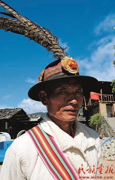 云南省迪庆藏族自治州维西傈僳族自治县的傈僳族男子头戴装饰有羽毛的帽子。