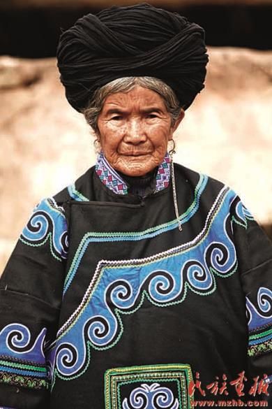 四川省凉山彝族自治州彝族老年妇女缠黑色头帕。