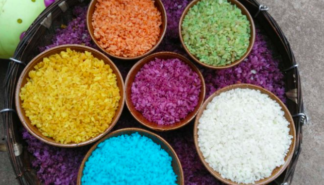 花糯米饭是先用各种植物的根、茎、叶、花经石臼冲捣细碎后,用水浸泡或煮沸一定时间,成为不同颜色的汁液。再用这些汁液分别浸泡淘洗干净的糯米,使其着色,蒸熟后即成不同颜色的糯米饭。其色彩有黑、红、黄、绿、紫、白(大米本色)等六七种。一般取五色为多。
