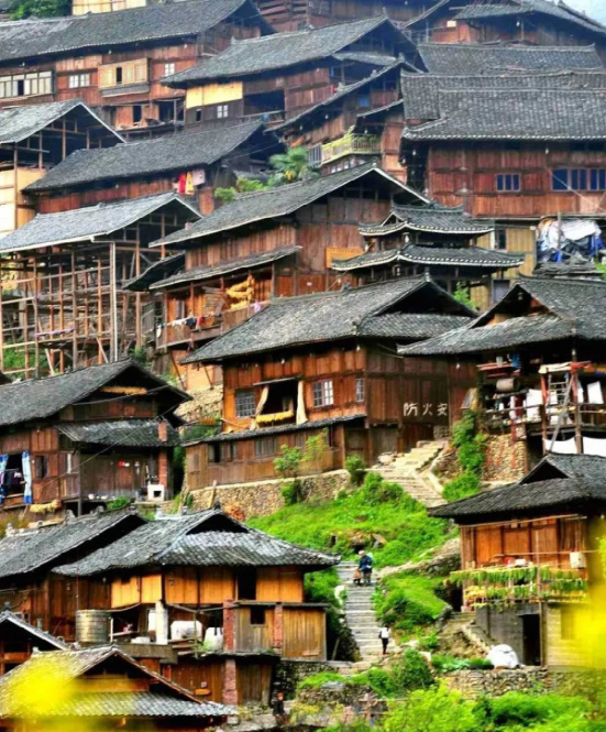 在雷山,苗寨吊脚楼依山而建,屋基开挖为上下二层,前檐柱或第二柱不落地,因此而得名吊脚楼,是苗族工匠们利用干栏式建筑在适应山地发展和变异的经典之作。