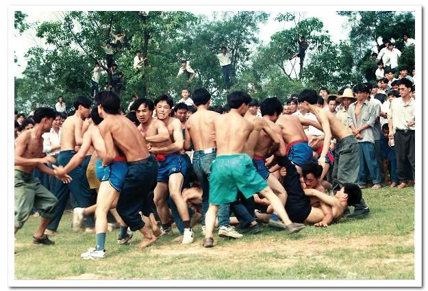 待贺节队回到主会场,花炮节正式开始,首先是舞狮表演,接着芦笙、卡罗舞表演,斗马、斗鸟以及赛马等活动各自展开。这些活动告一段落后,最精彩的节目——抢花炮开始了,人们像潮水般涌向主席台前,围成一个几十个平方米的空地作抢花炮场地。抢花炮分一、二、三等,抢三次,得胜者,抬着漂亮的花炮头及奖品兴高采烈地回村了。