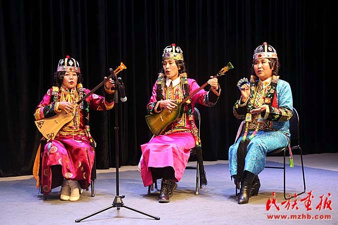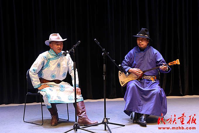 和布克赛尔蒙古自治县江格尔传承人(左)表演《江格尔说唱》。