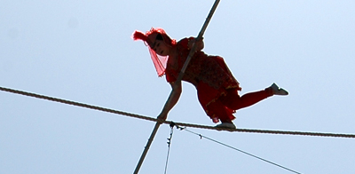 “达瓦孜”既是少数民族传统体育运动表演项目,也是节日里娱乐活动,它有杂技和体育的双重特点。“达瓦孜”高空走绳表演十分壮观,在空旷的场地上,中间耸立三十多米高的立杆,顶处扎一牌楼上挂彩旗。牌楼横杆两端有表演用的吊杠和吊环。表演技能的绳索长八十多米。表演者手持长约6米的平衡杆,不系保险带,在绳索上作前后走动、盘腿端坐、蒙眼行走,甚至脚踩碟子、飞身跳跃等一系列惊心动魄的动作。经过不断实践和发展,“达瓦孜”表演技巧有了新突破,在浓郁民族风味维吾尔族民间乐曲伴奏中,表演者轻松自如地在、高空绳索上踏着节拍跳舞歌唱,并且敏捷地变换着高难动作。