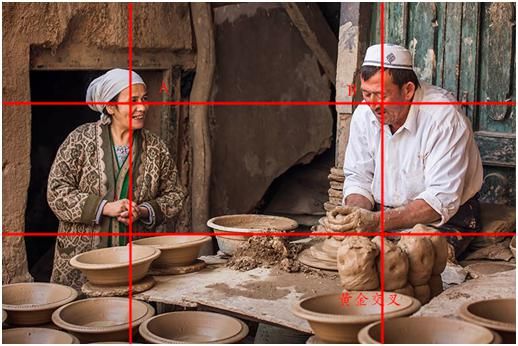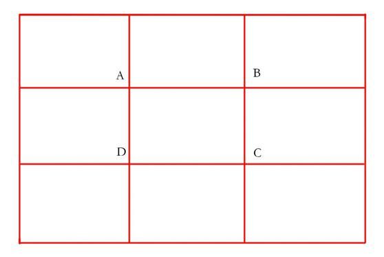 井字形构图和黄金分割法构图是什么意思呢?就是在拍摄的时候,拍摄主体也就是兴趣点,根据现场的情况,放在这ABCD这四个位置上,这样看起来画面是比较舒服,是比较协调的,比如说你拍摄一个人,人头应该是在交叉点上。