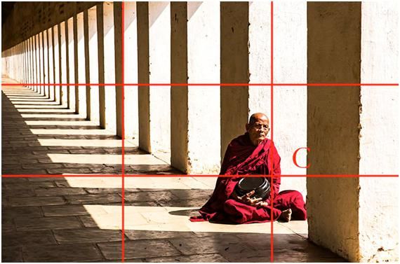 这三张图都是就是黄金交叉点构图的应用,第三张是在缅甸的拍的,当时这个僧人坐在有光的长廊里,他的头不在交叉点上,但落在相对差不多的位置。