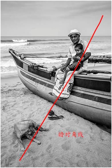 这个海边老人跟狗之间也形成了暗对角线,包括下面的这个在拍照的人跟这个雕塑之间也形成了一个暗对角线,所以这个画面非常平衡,不是一边重一边轻,而且不呆板。所以对角线这种形式非常实用。