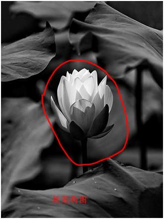 这张荷花改成黑白色调后,荷叶、荷花形成了巨大的反差及包围的氛围,也属于框架式构图形式。