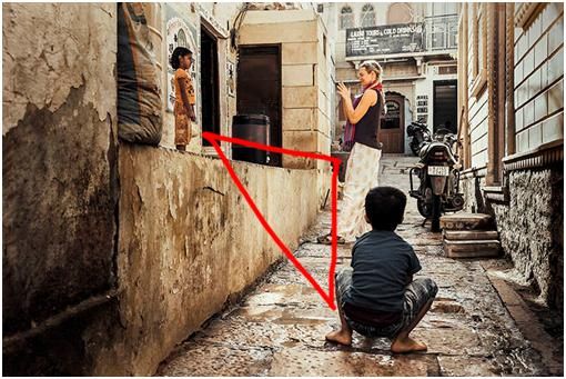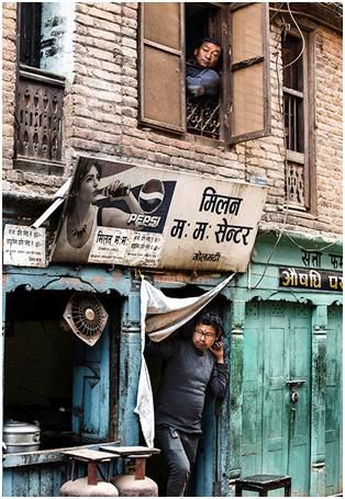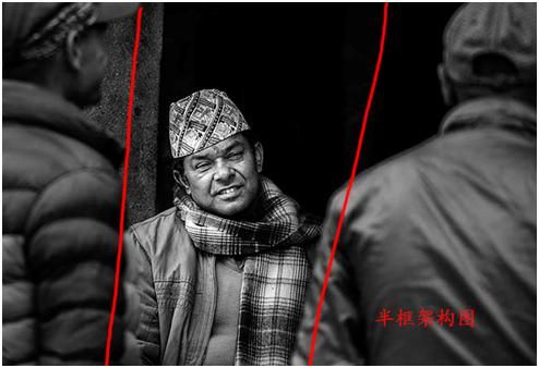 上面这两张图第一张,归类为半包围。第二张图也是半包围,在尼泊尔的一个小镇拍的,旁边两个人是背影,实际上把这个人夹在中间,所以这个人特别容易引起你的注意,形成了一种包围趋势,在电影的镜头语言中运用的比较多。